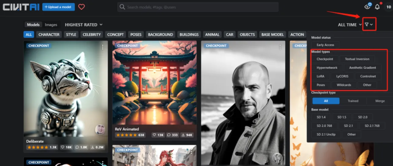 而大多数的模型都是在Civitai(C站)这个网站里面https://civitai.com/
