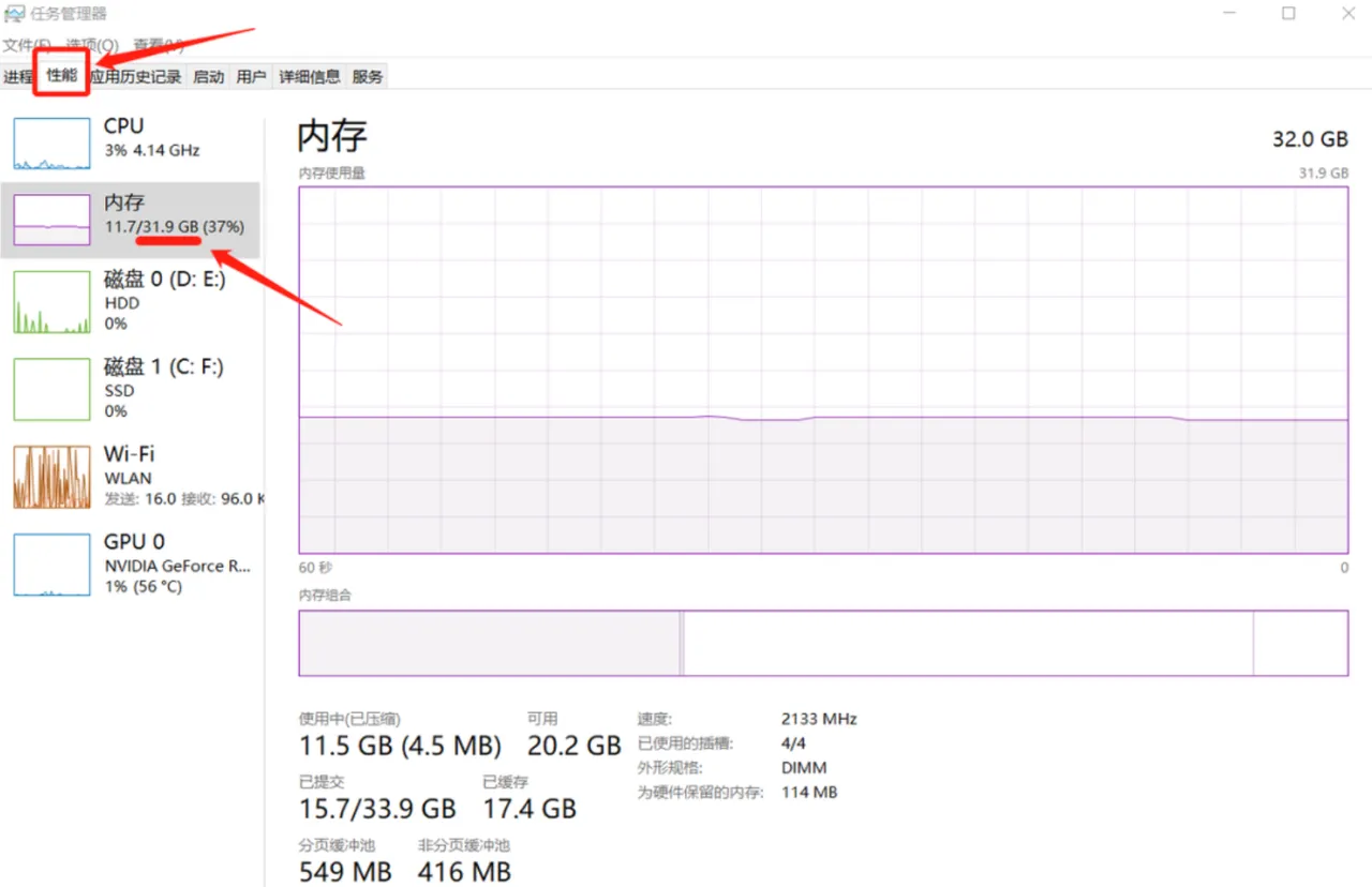 在“性能”里面找到“内存”,这里的内存不是电脑的存储内存,而是运行内存噢!