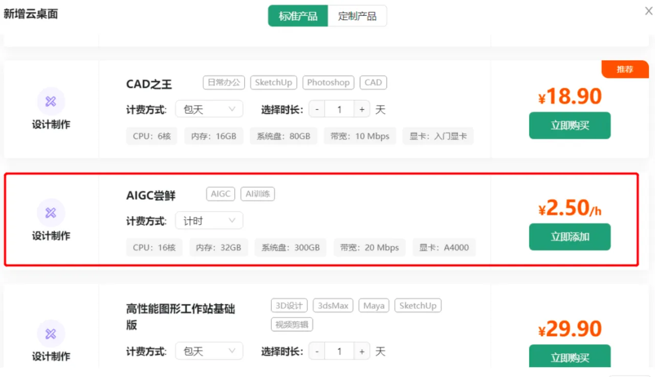 想玩Stable Diffusion可以选“AIGC尝鲜”,一般新注册的会有优惠券,可以免费试用