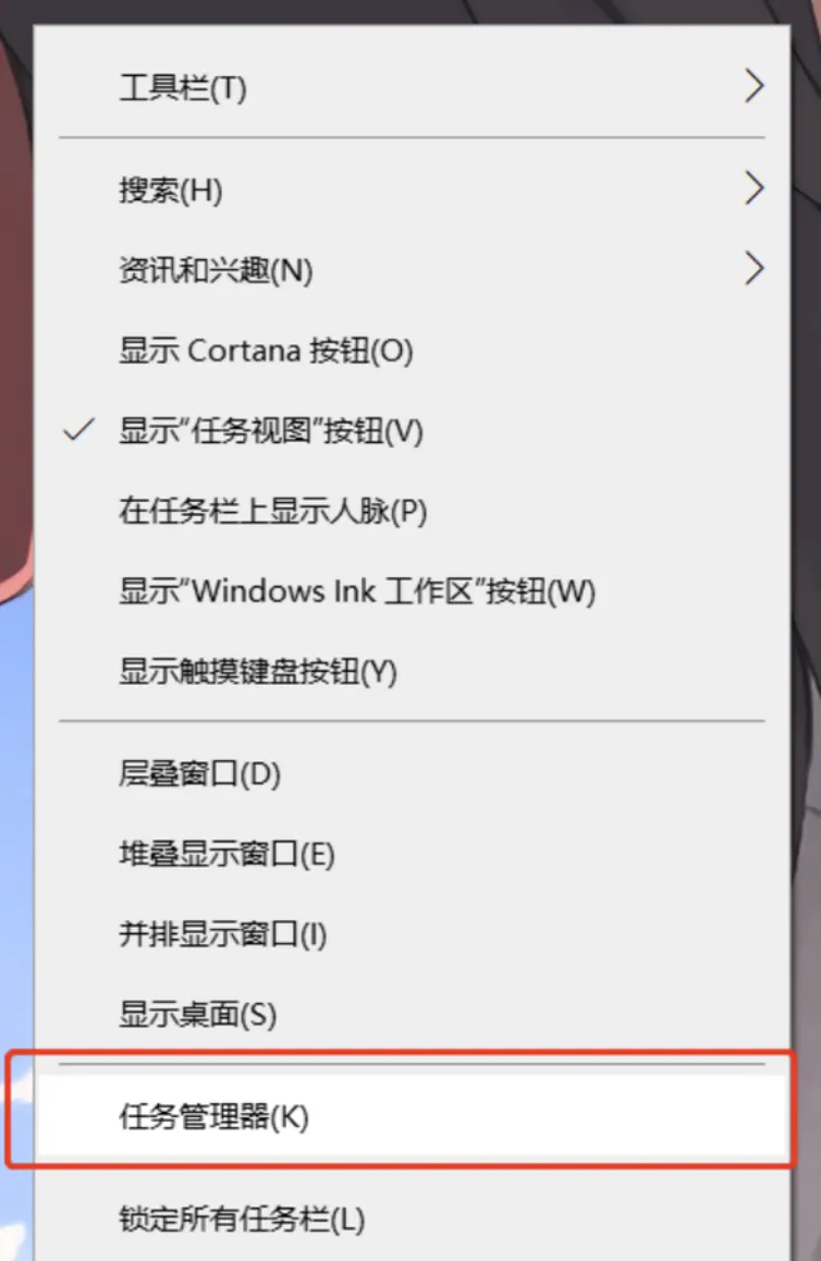 ①鼠标右击桌面底部任务栏——点击“任务管理器”