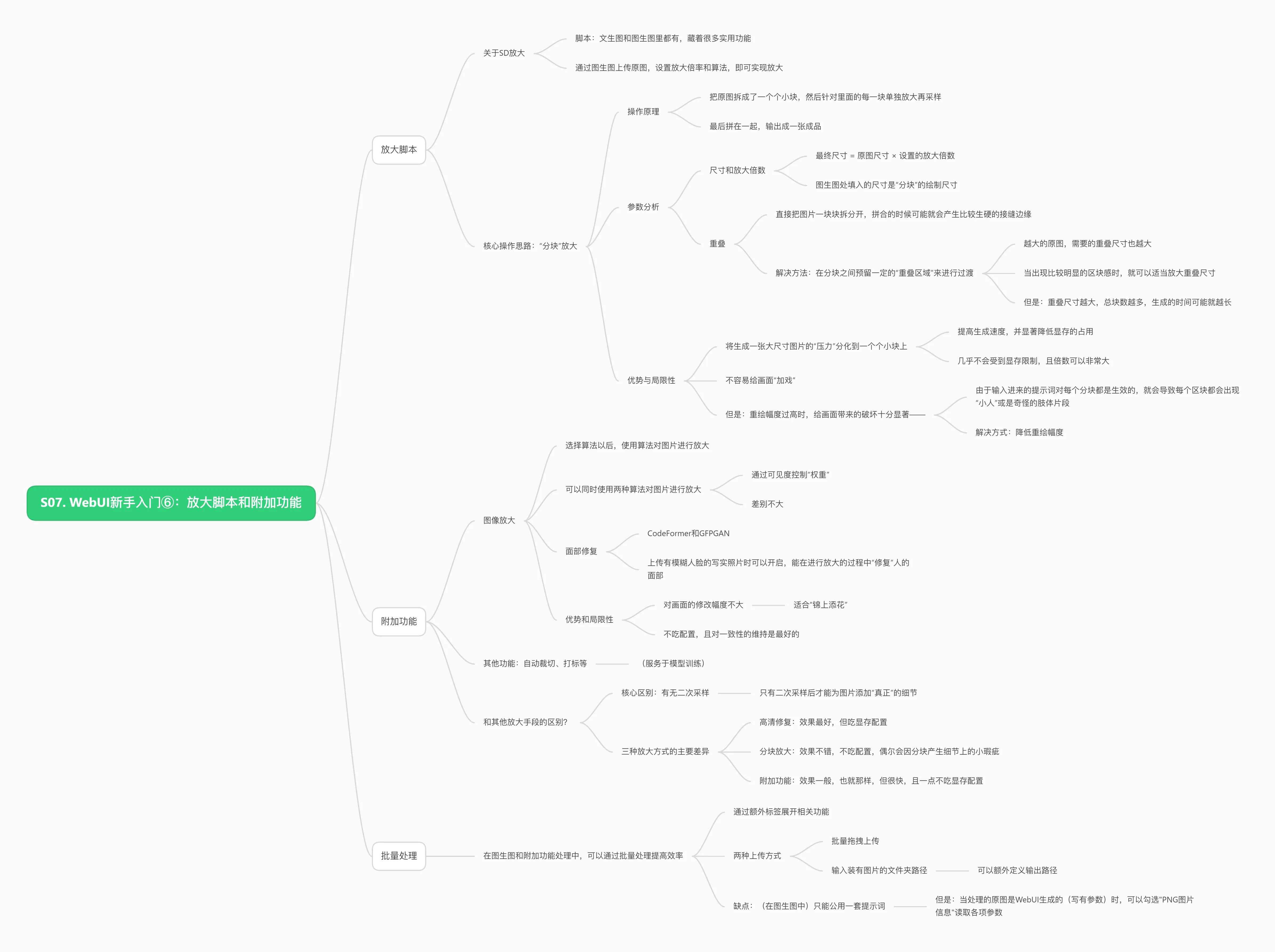 课程对三种放大方式做了优缺点对比,提出在高配环境下用高分辨率修复最稳妥,而在配置有限时 SD 放大更高效,附加功能则适合快速批量处理。最后还介绍了批量处理的用法,让用户能一次性对成批图片执行统一的优化流程。